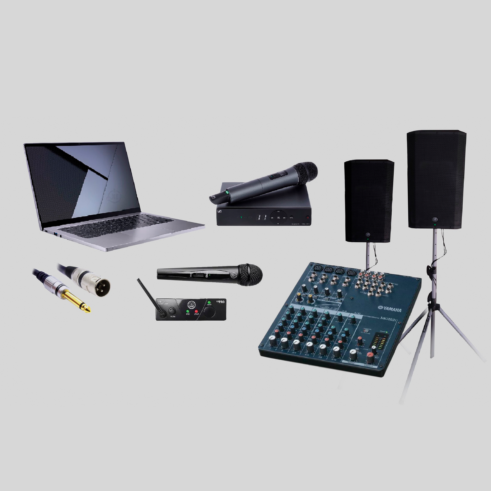 Звуковое: Акустическая система – 2 шт; Стойки для колонок – 2 шт; Студийный микшерный пульт – 1шт; Радио микрофоны – 2 шт; Ноутбук - 1 шт; Коммутация и комплектующие.